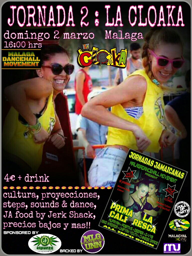 […] DOMINGO 2 – JORNADA II Asociación Cultural La Cloaka – Málaga 16 a 00 hrs 4€ con consumición DANCEHALL CULTURE & JERK SHACK FOOD!! Seguimos con PRIMA CALI y LA RESCA en una jornada de domingo perfecta para rematar la fiesta del sábado noche y cerrar un fin de semana a gusto y a la jamaicana!! Desde las 16 hasta las 00-01 hrs, iremos dando un repaso cultural y animado al dancehall jamaicano, en evolución por tramos horarios: -proyecciones en pantalla sobre documentales y películas que incluyen espacios de baile dancehall, con intervenciones de las invitadas comentando las diferentes escenas -enseñanza de rondas de pasos Continuar leyendo […]