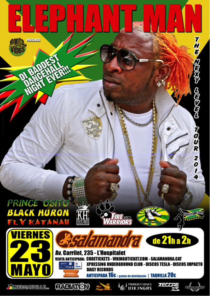Elephant Man viene a España, y lo va a hacer con una única fecha en nuestro país, Barcelona el día 23 de Mayo en la Sala Salamandra. Pero en Reggae.es y ACR no queremos que te lo pierdas si estás lejos, así que nos hemos aliado con la productora Roots & Vibes para fletar un autobús que saldrá de Madrid y te dejará en el concierto, con la única preocupación de disfrutar del concierto, único en España, a un precio que no tiene competencia puesto que el pack incluye pasaje de Autobús y la entrada al show, por sólo 50 €