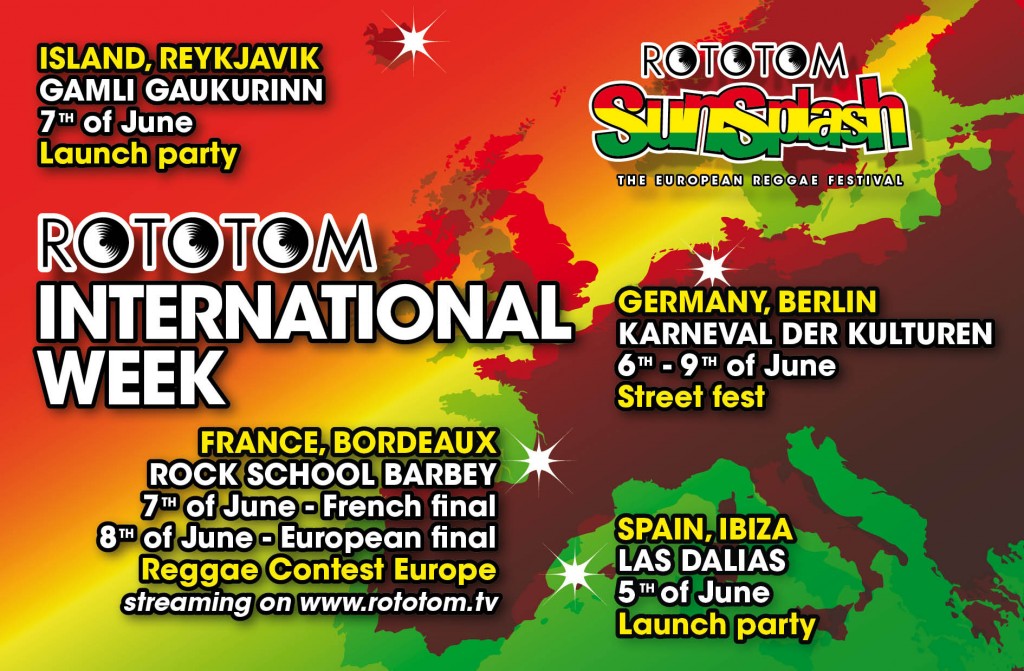 Rototom2El Rototom Sunsplash se prepara para vivir la que sin duda será su semana más internacional. En tan sólo cinco días, del 5 al 9 de junio, el festival reggae más grande de Europa estará presente en cuatro ciudades del viejo continente, Ibiza (España), Bordeaux (Francia), Berlín (Alemania) y Reikjavic (Islandia), para participar en otros tantos grandes eventos relacionados con la música y la cultura.