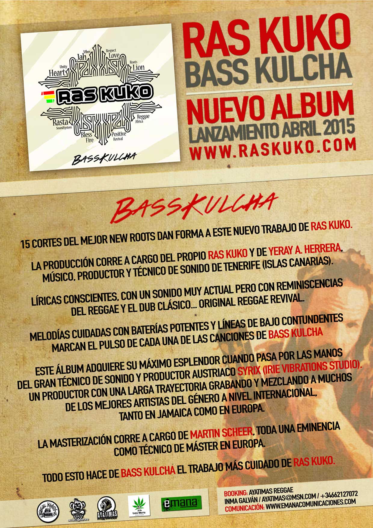 Sin duda es uno de nuestros mejores embajadores, uno de los pioneros del reggae en nuestro país con la banda Cañaman. Ras Kuko vuelve a la escena por todo lo alto con Bass Kulcha, su nuevo álbum. Destacamos la cuidada producción a cargo de Yerai Herrera y el propio Kuko y los arreglos del productor austriaco Syrix (Irie Vibration) y la masterización en el estudio de Martin Scheer.