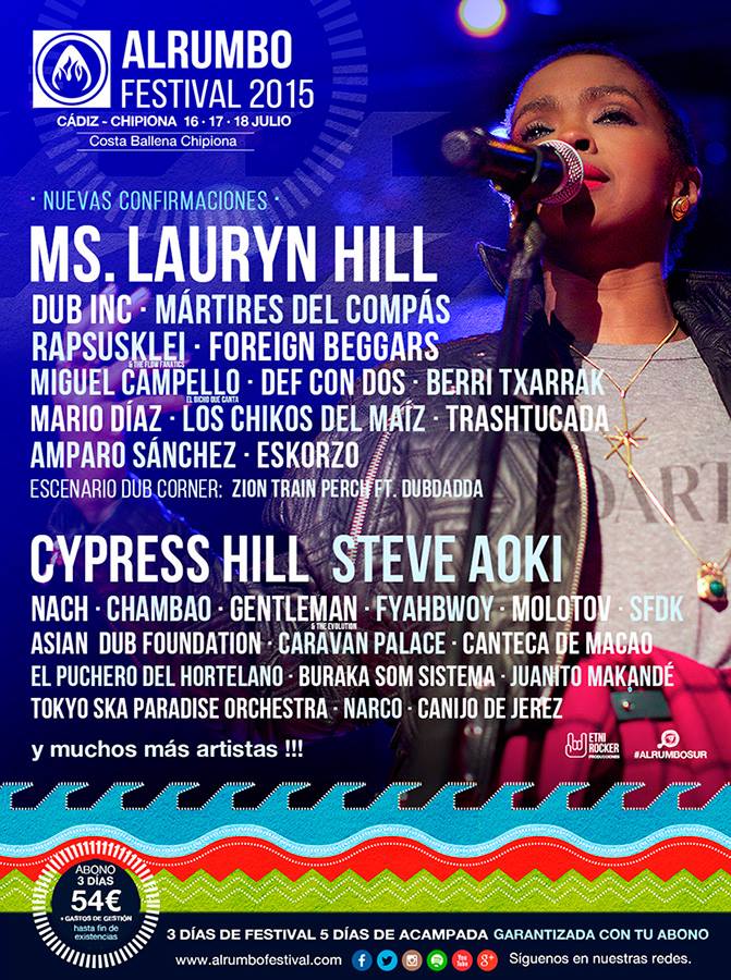 Lauryn Hill siempre ha tenido relación con la música Jamaicana y se unirá a Dub Inc, Gentleman, Fyahbwoy, Rapsusklei, Asian Dub Foundation, Zion train y la Tokio Ska Paradise Orchestra en una plantilla de lujo para los que amamos el sonido de la isla del tesoro. No obstante, cabe destacar que Al Rumbo también programa un estupendo cartel que aglomera grandes nombres del Hip Hop, la música electrónica y apuestas más alternativas, fusión, etc. Hay para todos los gustos, Steve Aoki, Cipress Hill, Nach, Berri Txarrak…