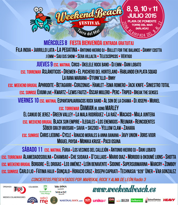 Del 8 al 11 de julio se celebrará en la espectacular playa de Torre del Mar (Málaga) uno de los festivales musicales que ha llegado para quedarse, el WEEKEND BEACH FESTIVAL TORRE DEL MAR.Conciertos presentados por dos grandes voces de la radio en nuestro país: MARISKAL ROMERO de Mariskal Rock Fm y ALMA DE LEON de Radio 3.