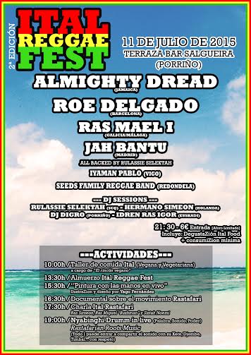 Os presentamos “Ital Reggae Fest” un nuevo festival reggae que se celebrara en el Bar Salgueira de Porriño (Galicia) el próximo sábado 11 de Julio. Este festival cuenta con la característica especial de querer acercar la cultura rastafari a la gente por eso contara con una serie de talleres, charlas y exposiciones filmográficos que trataran de explicar que es el movimiento rastafari para la gente que sabe poco o nada sobre esto.