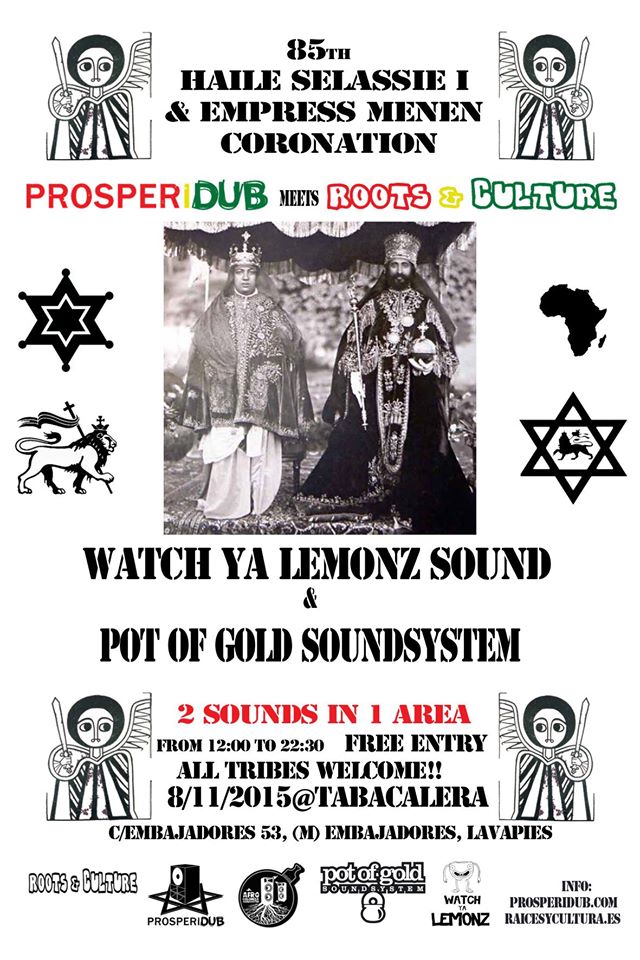 Las asociaciones Roots & Culture y ProsperiDub unen fuerzas el día 8 de Noviembre para conmemorar el 85º aniversario de la coronación de Haile Selassie I. Fiesta al estilo tradicional y con 2 sound systems en una misma área.