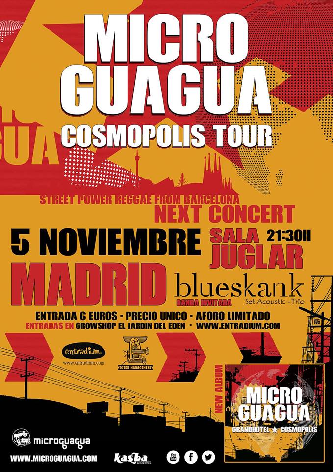 El jueves 5 de Noviembre en la Sala Juglar de Madrid podremos disfrutar del concierto de presentacion del nuevo album de Microguagua «Grandhotel Cosmopolis». Blueskank en trio acustico completan el cartel.