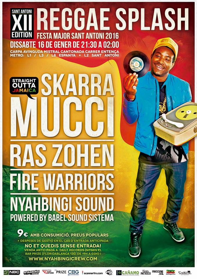 ¡Vuelve una nueva edición del Sant Antoni Reggae Splash! Uno de los festivales de música jamaicana más longevos de Catalunya teñirá de nuevo de reggae y dancehall el barrio de Sant Antoni de Barcelona. El contará este año con la presencia de uno de los artistas más conocidos y activos del momento, directamente desde Jamaica: Skarra Mucci, “the lyric millionaire”, así como con el artista barcelonés  y los colectivos  y Nyahbingi Sound. Todo esto aderezado con el sonido artesanal de Babel Sound Sistema.