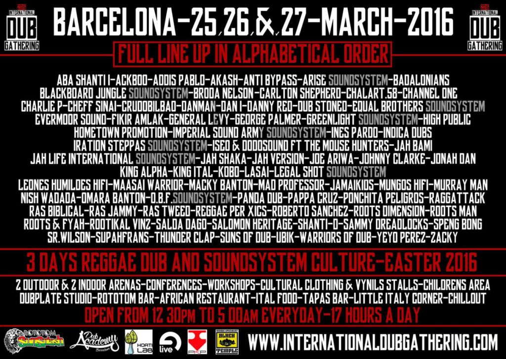 Si señores, ya estamos en Marzo. mes en el que se presenta el International Dub Gathering. Por fin tenemos en el estado español un festival específico dedicado en exclusiva al Sound System, tras visitar las arenas de UK o Francia nos toca a los españoles recibir nuestra gran dosis de bajos pesados. Y es que International Dub Gathering no tiene nada que envidiar a las plazas europeas reuniendo a un elenco de artistas absolutamente increíble para tres días de Sound System y Vibes como nunca antes las habías sentido.