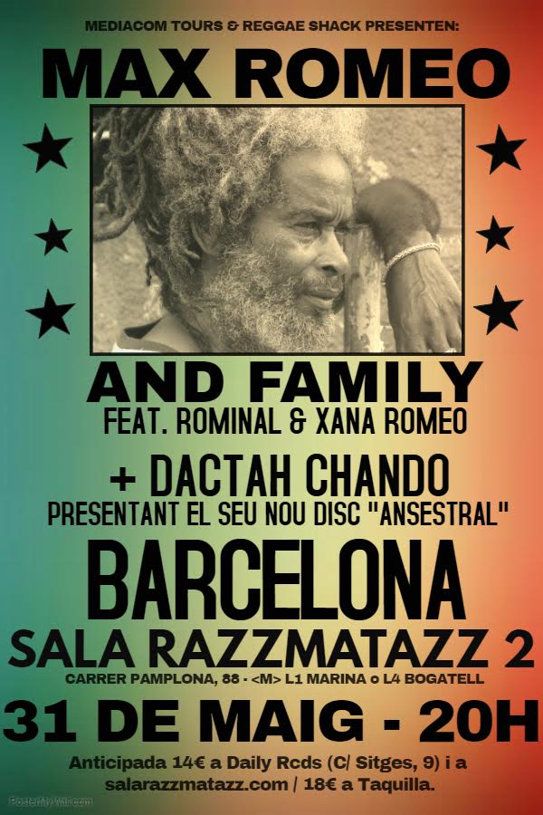 Recordemos el últmo álbum de estudio de 2014 llamado «Father & Sons», pues este año viene a Barcelona al lado de sus hijos Rominal y Xana Romeo que están empezando sus carreras artísticas en Jamaica con mucha fuerza, atentos a estos dos nombres en el futuro!