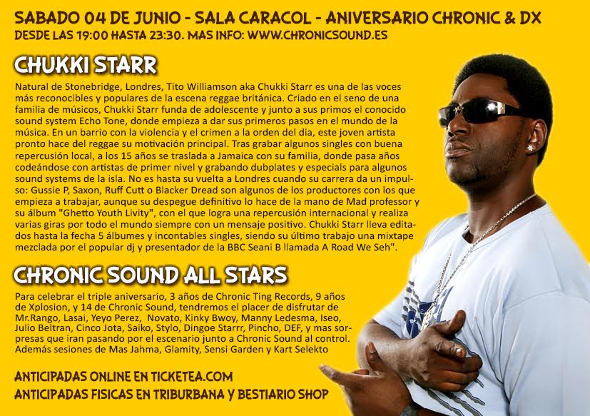 Para una ocasión tan especial, han querido contar con un artista que lleva muchos años sin visitar la peninsula, el gran CHUKKI STARR directamente desde Londres (UK). Además estarán invitados al micrófono todos los artistas amigos de Chronic, nombres de lujo como MR.RANGO, LASAI, NOVATO, YEYO PEREZ, KINKY BWOY, JULIO BELTRAN & SAIKO FLACO & STYLO de PACHAMAMA FAMILIA, PINCHO, DEF,  y un montón mas de sorpresas por desvelar.