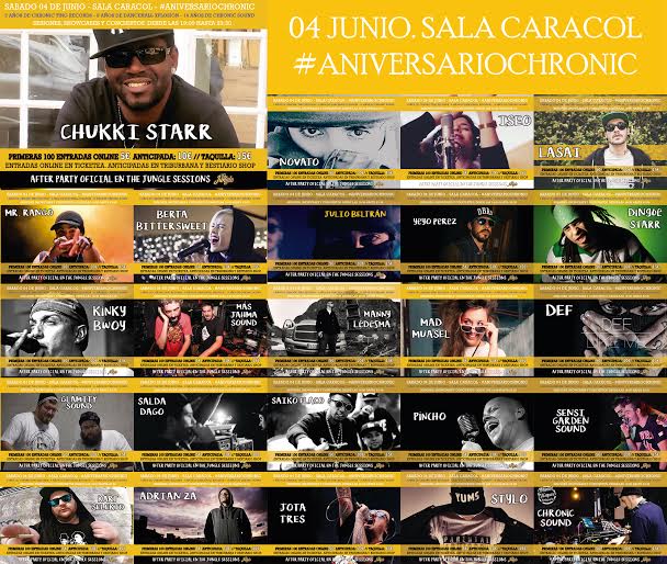 Para una ocasión tan especial, hemos querido contar con un artista que para es muy especial y uno de los mas influyentes en toda Europa, que lleva muchos años sin visitar la peninsula, el gran CHUKKI STARR directamente desde Londres (UK). Además estarán invitados al micrófono todos los artistas amigos de Chronic, nombres de lujo como Mr.Rango, Lasai, Novato Dirtydansall Crew, Yeyo Perez, Berta BitterSweet, Salda Dago Dirtydansall Crew, MadMuasel DirtyDansall Crew, Kinky Bwoy, Manny Ledesma DirtyDansall Crew, Julio Beltrán Pachamama Familia & Saiko Flaco Afrodisaiko & Andrés S. Pleito Searcher de Pachamama Crew Oficial,Pincho, DEF, Dingoe Starr Chronic y un monton mas de sorpresas por desvelar.