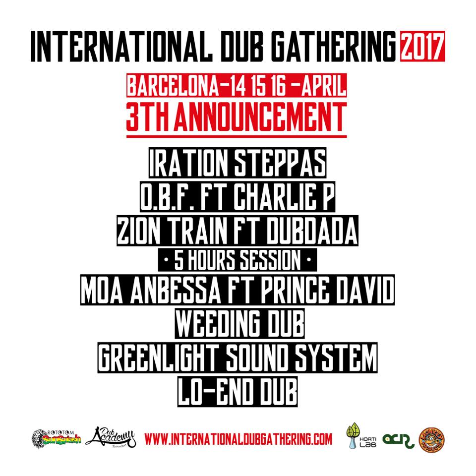 Llega el tercer anuncio de International Dub Gathering el evento Dub y Sound System más importante de nuestro estado y que en su primera edición convocó a más de 7000 aficionados con un cartel absolutamente envidiable que esperan superar tanto en cantidad como en calidad en esta segunda edición así a Jah Tubbys SoundSystem del Reino Unido -junto a Mackie Banton, Errol Bellot & Professa Natty-, Word Sound & Power Soundsystem Jimmy Ranks y Bobo Blackstar– y Watts Attack Soundsystem, Dub Dinasty, Ashanti Selah ft. Junior Roy, Buckshott ft. Nytto Dread y Echo Chamber Hifi Roots se les unen Iration Steppas Official O.B.F Sound System O.B.F Sound System Zion Train ( 5 horas de sesión) Moa Anbessa ft Prince David Weeding Dub Green Light Soundsystem Lo-End Dub.