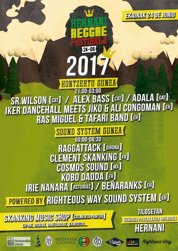 Este sábado 24 de Junio desde las 21h se celebrará Hernani Reggae y tenemos el placer de recibir a Sr. Wilson, Alex Bass, Adala, Ras Miguel y Tafari Band, Iker Dancehall, Jiko & Ali Congoman en el escenario principal organizado por Pintxo Reggae y Musikatea Elkartea. Por esta primera entrega en el área sound system contamos con la presencia de Raggattack, Irie Nanara, Cosmos Sound, Clement Skanking, Dadda, Beñaranks, organizado por Righteous Way Sound System y Hernaniko Ahotza Elkartea que terminará el como colofón hasta las 6:00 de la mañana.