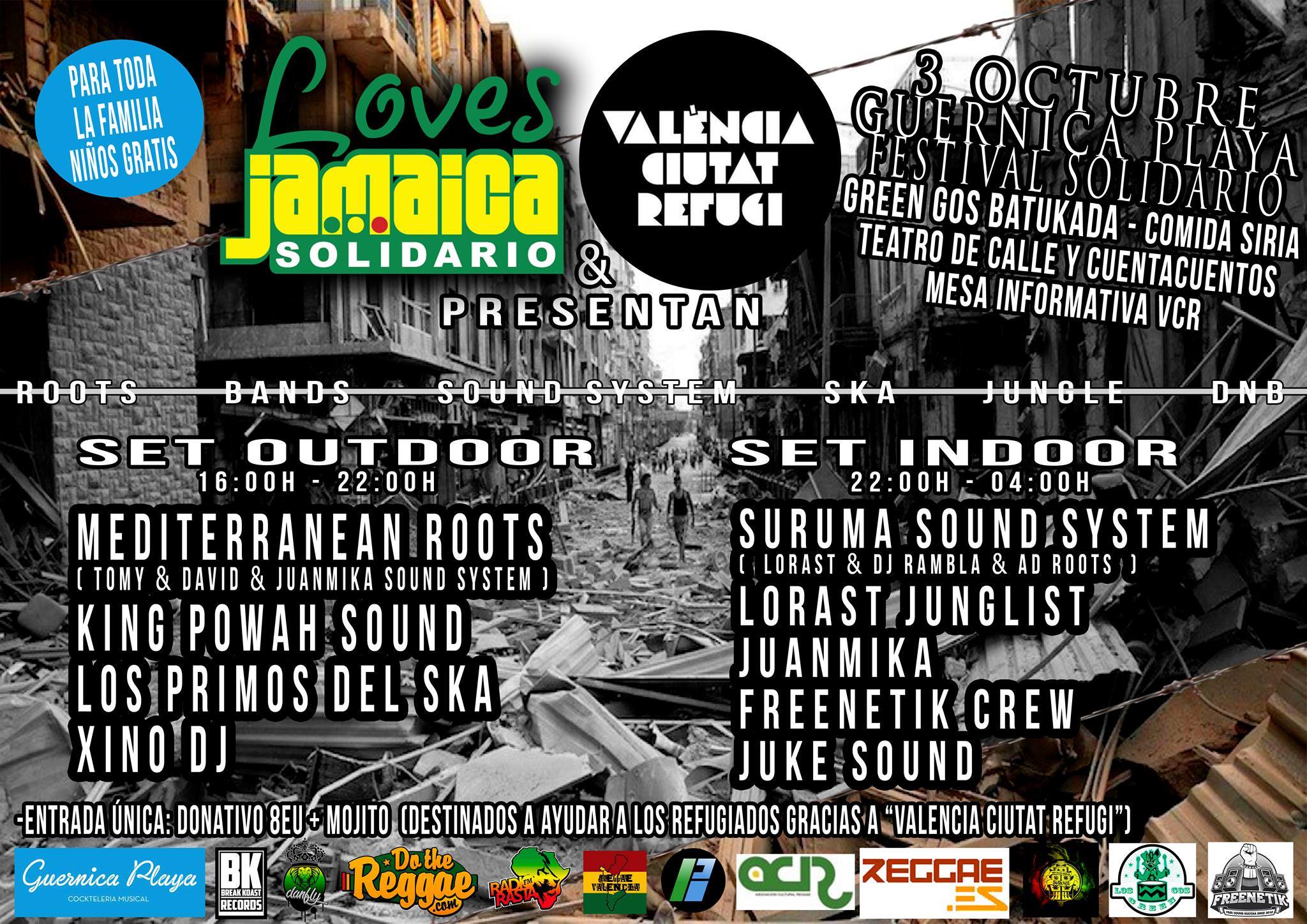 Por fin vuelve a Valencia Loves Jamaica festival Tour después de su exitosa gira por 9 ciudades españolas. Será el 3 de octubre en Guernica Playa, en Valencia, a partir de las 16 horas. Y en esta ocasión, la cita es solidaria, ante la gran catástrofe humanitaria de los refugiados de guerra sirios y de otras zonas del mundo.