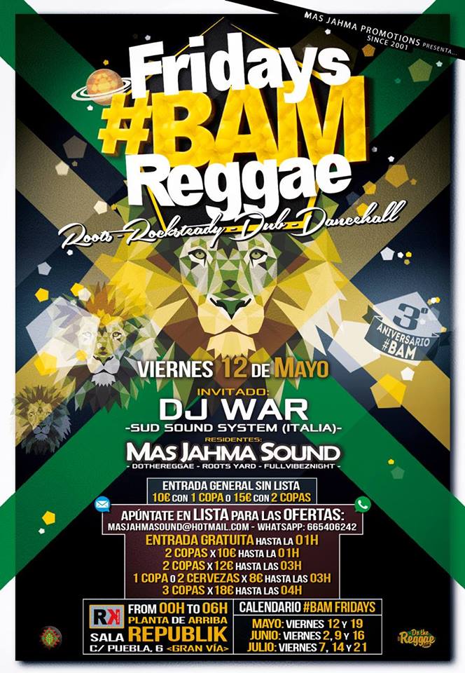 La Sala Republik Club volverá a dar acogida a estas sesiones de Reggae. Este espacio está situado en pleno centro de la ciudad. <Metro: Gran Vía>. El horario de #BAM es de 00h a 06h.