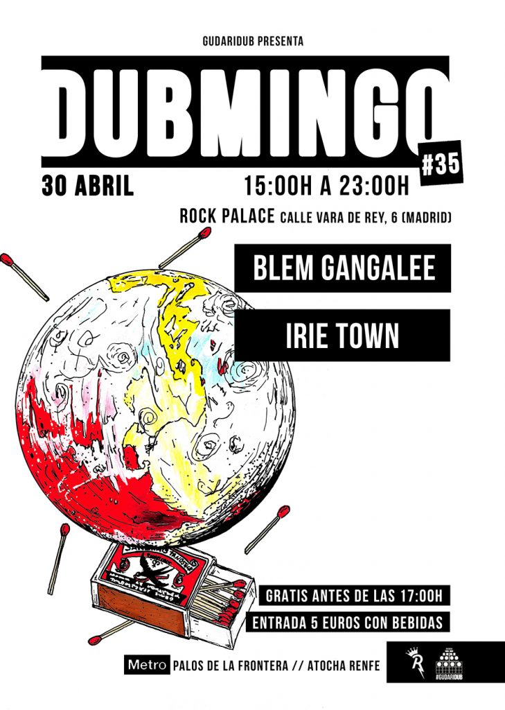 Siguiente estación dubminguera, sin preambulos ni esperas de 15 días… esta misma semana, el domingo 30 de abril cerramos el mes con el #Dubmingo 35. En esta ocasión contaremos con el productor Blem Gangalee a la selección y «live dub set» así como el conocico canal de difusión Irie Town en su faceta «dj set». Un pedacito de Málaga en el centro de Madrid.
