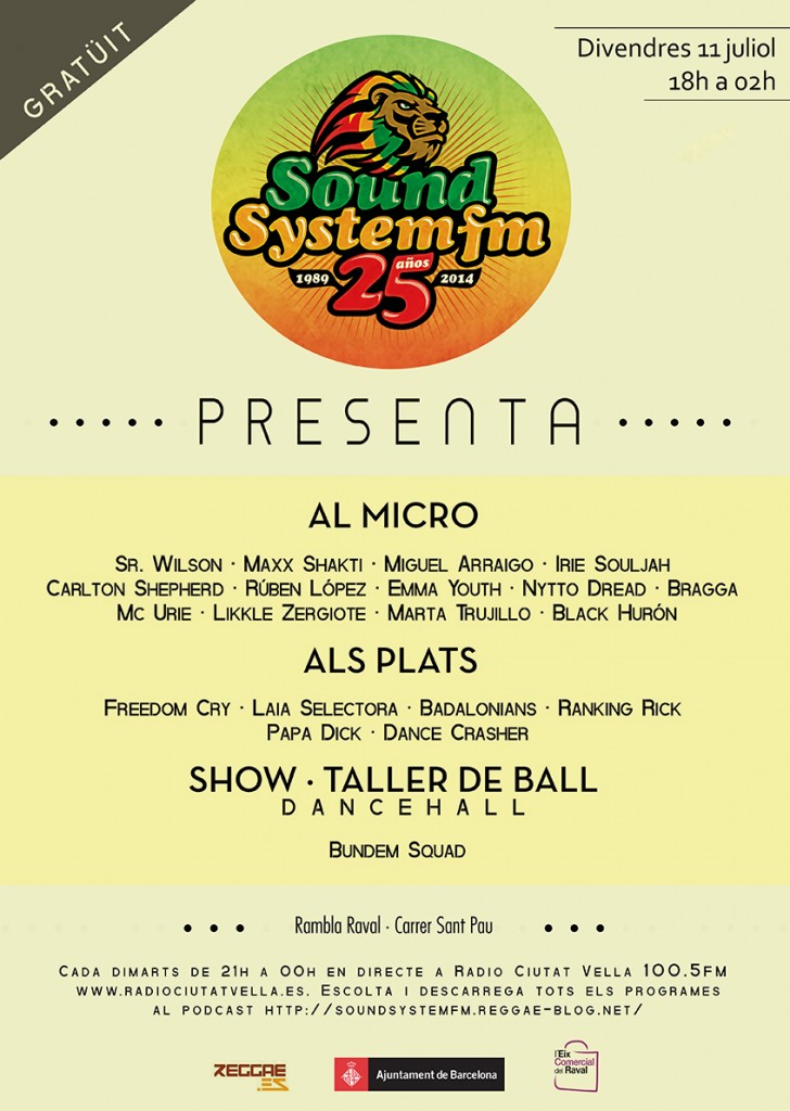 SSFM_25ANYS_2Tras el maratón radiofónico de 12 horas emitido el pasado 7 de junio, el veterano programa dedicado al sonido jamaicano vuelve a la carga con una gran fiesta en directo en la que participarán los sounds de la casa y una nutrida selección de djs y cantantes que se alternarán en el escenario con el baile de uno de nuestros dancehall teams con más renombre.