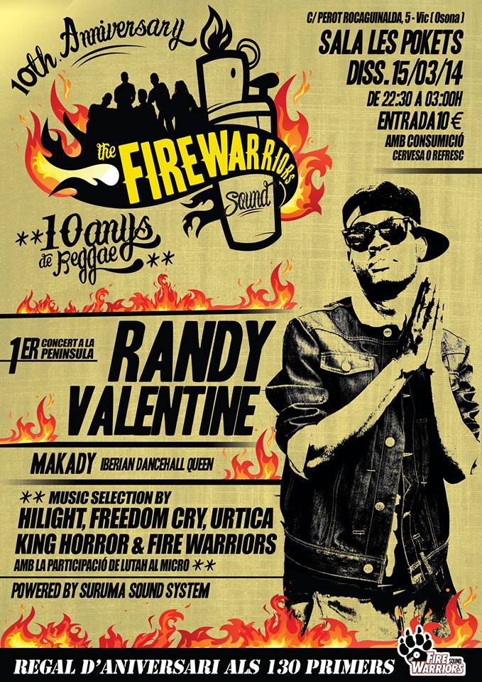 FireWarriorsEl próximo sábado 15 de marzo de 2014, Sound celebra su décimo aniversario en la sala Pockets de Vic (Barcelona), con la actuación del cantante de reggae jamaicano Randy Valentine y con la presencia de algunos de los mejores sounds de reggae y dancehall de Barcelona.