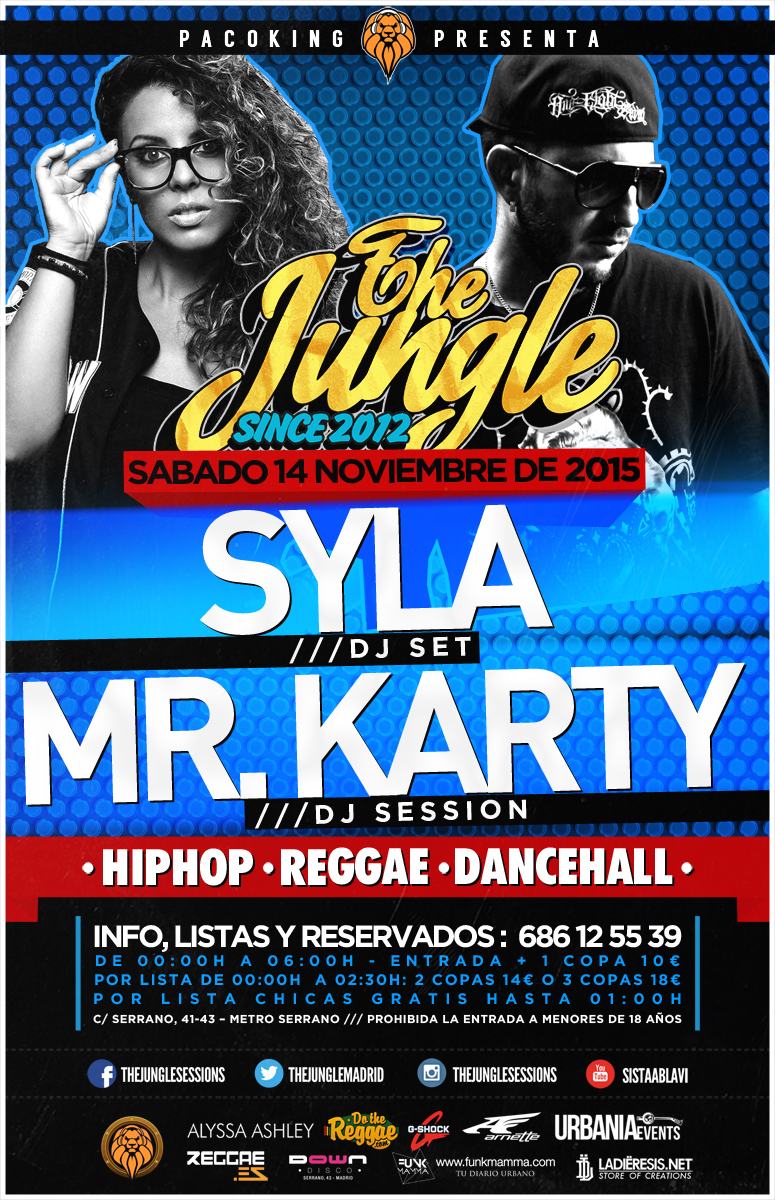 The Jungle LogoEste sábado 14 de noviembre los invitados en Sessions, la mejor fiesta de la noche de Madrid, son Syla y su cuidada selección a los platos de los mejores temas de Rap, RnB, Nu Soul… de ayer y hoy. Y Mr. Karty que regresa de nuevo cargado del mejor Reggae, Dancehall, Afrobeat.