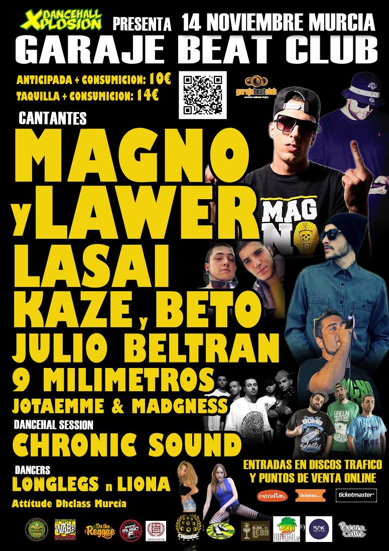 dancehall-xplosionProducciones Dancehall Xplosion presenta el próximo 14 de Noviembre en Sala Garaje Beat Club los conciertos, sesiones, showcases y actuaciones de: