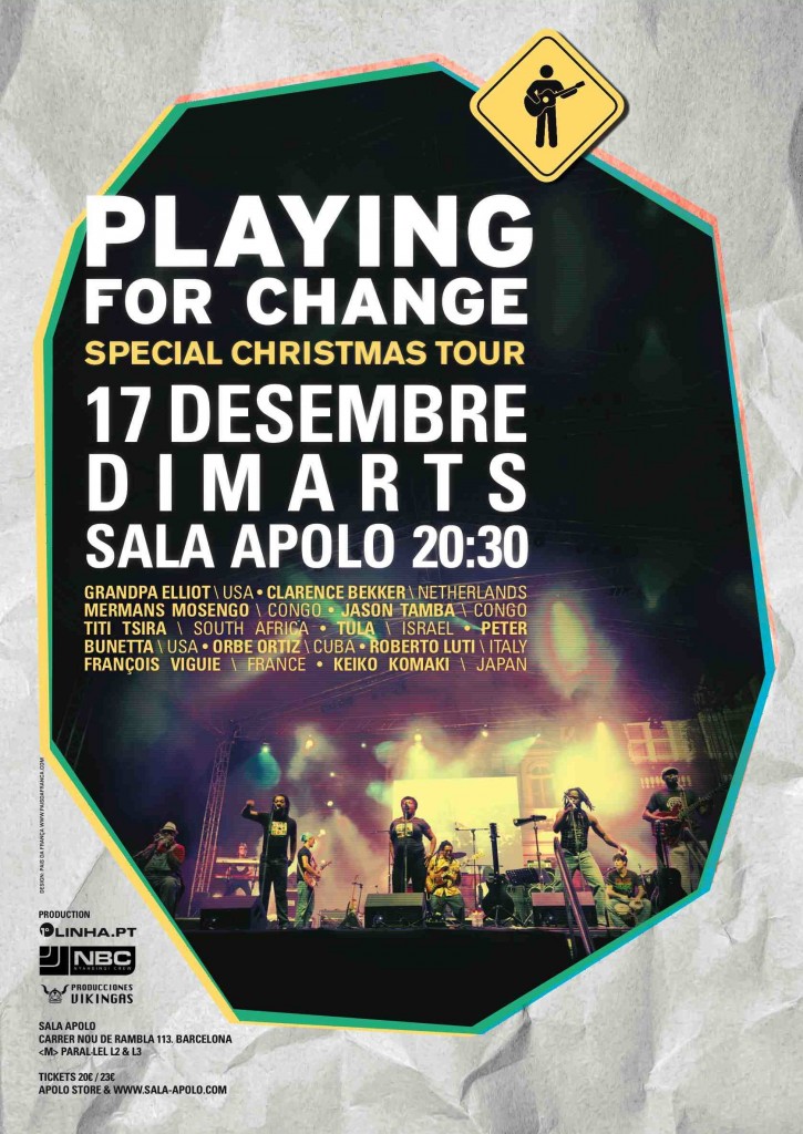 Playing_for_change-logoEl próximo Martes 17 tendrá lugar unos de los eventos mas entrañables y esperados de la musica en general y que envuelve también al reggae en su justa medida, nos visitan Playing for a Change, el proyecto de músicos callejeros y superestrellas de la musica, que interpretan temas capitales de la musica moderna y que se materializó en una serie de vídeos que todos conocemos. Pero que es mucho más como nos explican más abajo los promotores del evento