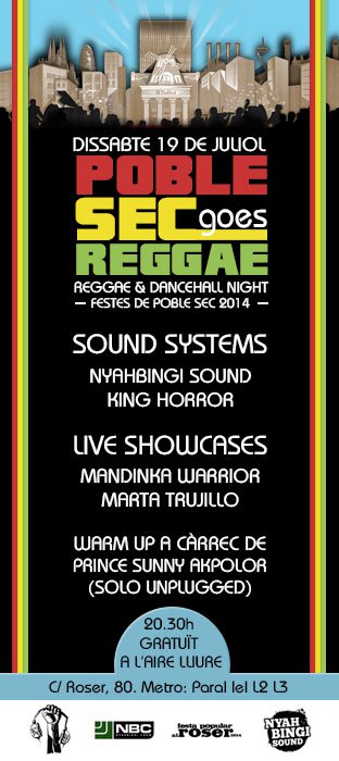 cartell-poblesecMandinka Warrior, Marta Trujillo, King Horror y Sound llenarán de música jamaicana la Festa Major de Poble Sec de este año. El show acústico de Prince Sunny Akpolor abrirá la noche. Será el sábado 19 de julio de 21:00 a 02:00 en la confulencia de la calle Roser con la calle Magallanes. Al aire libre y gratis. Don’t miss!!!