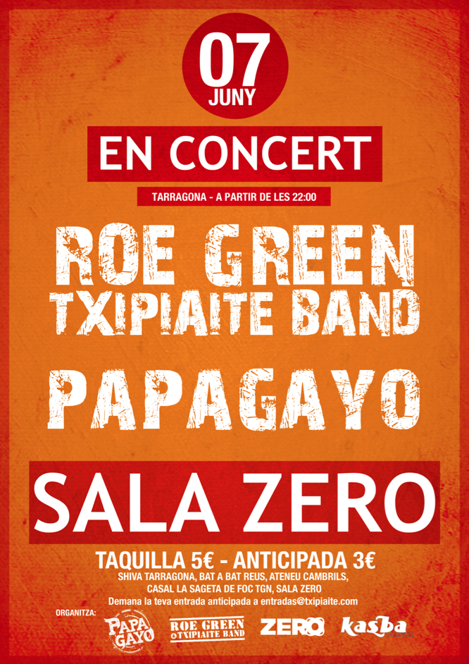 Este sábado día 7 de junio a partir de las 10 de la noche las dos bandas de Tarragona Papagayo y Roe Green & Txipiaité Band actuarán en la Sala Zero de Tarragona con motivo de la presentación de sus nuevas giras 2014.