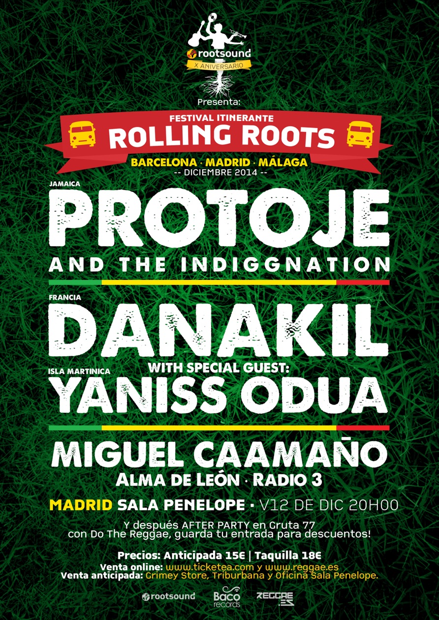 La agencia Rootsound continúa celebrando su X Aniversario, en esta ocasión nos presenta “Rolling Roots”, un festival itinerante que pasará por Madrid el viernes 12 de Diciembre en la Sala Penelope y que reune a los artistas Reggae de su catálogo, Protoje and The Indiggnation y Danakil, más dos artistas invitados, el gran Yaniss Odua y Miguel Caamaño de Alma de León (Radio 3). Cuatro ineludibles artistas de la escena reggae internacional que mejor representan la diversidad del movimiento reggae en la actualidad.
