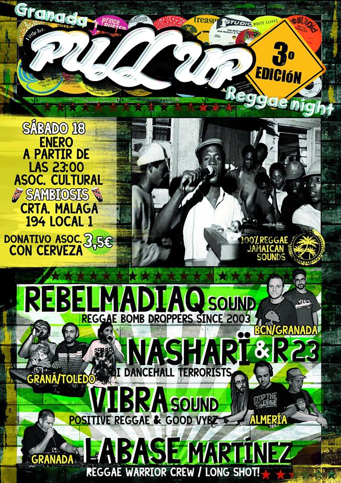 pull-up-reggae-nightEl próximo día 18 de Enero se celebrará en Granada la tercera edición del  de música jamaicana que ya ha puesto a bailar hasta el amanecer a todos/as los/as adictos del en la ciudad . En esta ocasión las Soundsystems y  los selectas encargados de animar la noche  serán: Labase Martínez, Vibrasound, Nasharï & r23, sound.