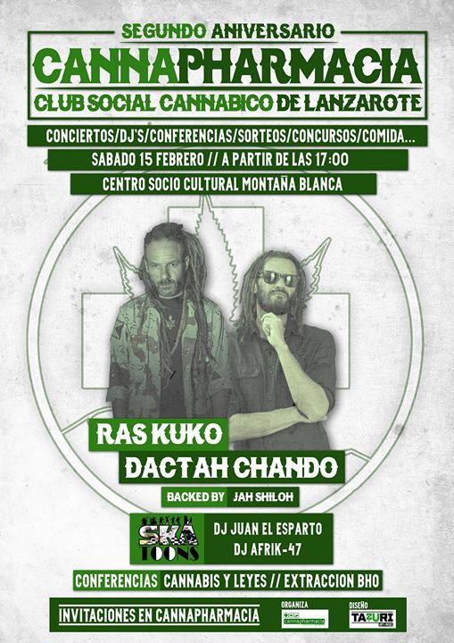 ras-kuko-dactah-chandoEl próximo sábado 15 de Febrero el club Cannabico de Lanzarote Cannapharmacia cumple dos años de vida y lo querido celebrar con una actividad que aúna diversión, cultura y educación sobre los temas que trabajan.