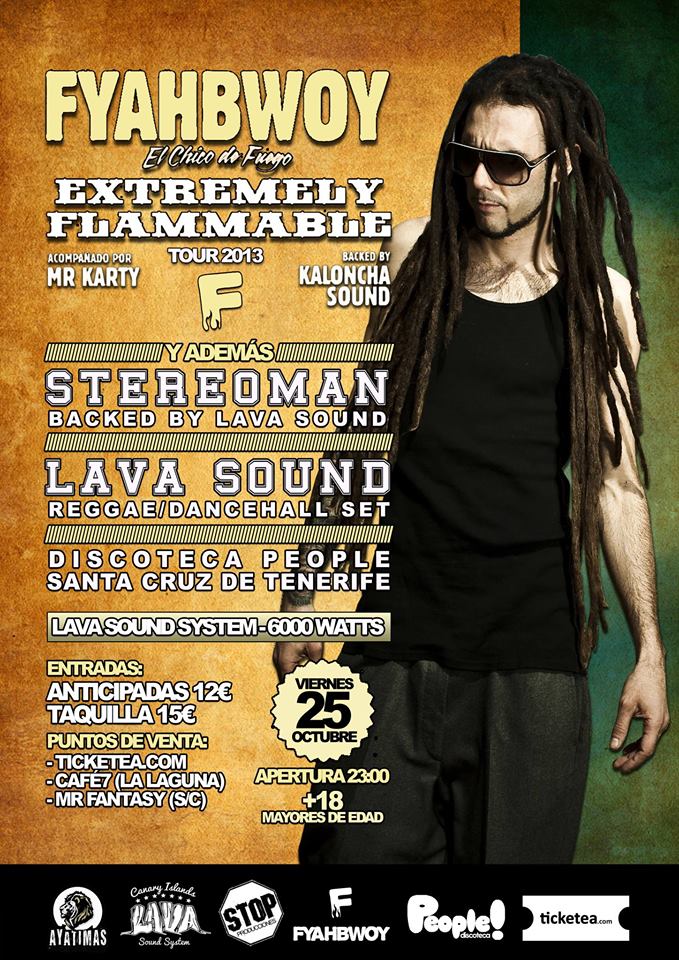 y preparan la llegada a Tenerife del tour de Swan Fyahbwoy: ‘Extremely Flammable’. El artista madrileño continúa presentando su último trabajo discográfico, del que ha cosechado un gran éxito llenando salas de ciudades de toda España y pasando por los escenarios de los festivales más importantes, como recientemente hizo en el Sunsplash, el festival de Reggae más importante de Europa.