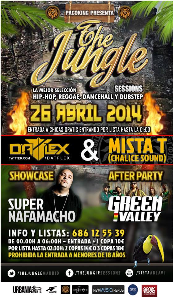 the JungleTras el concierto presentación de hijos de la Tierra de Green Valley os espera una nueva sesion de reggae, Hip Hop, dancehall, jungle y Dubstep en The Jungle Sessions, esta vez con (componente legendario de CPV), Datflex y Mista T.