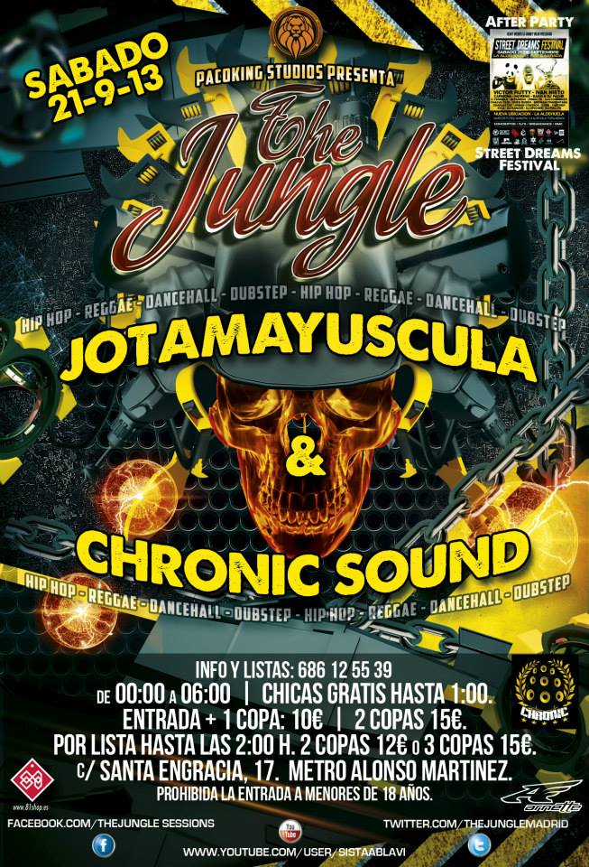 Chronic2Vuelve The Jungle con la edición de esta semana. Esta vez nos traen a , mítico productor de Hip Hop y componente de CPV y al ya veterano sound de y Dancehall, Sound. Ambos prometen una noche rap, y difícil de olvidar, Os recordamos que a partir de ahora tendréis noche de Jungle todos los Sábados. No faltéis a la cita.