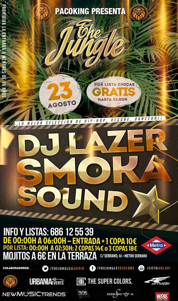 DJ Lazer y Smoka Sound son los encargados de devolver los sonidos a la sala Jungle de nuevo tras un breve descanso, dar color y fiesta a los sábados en Madrid con los mejores artistas especializados en RAP, REGGAE & DANCEHALL!!