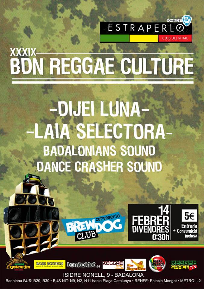 bdn reggae culture-14-febreroEl próximo viernes 14 de Febrero  a partir de las 00:30 hasta la 6:00, vuelve la fiesta mensual  Bdn Reggae  en la sala Estraperlo de Badalona.