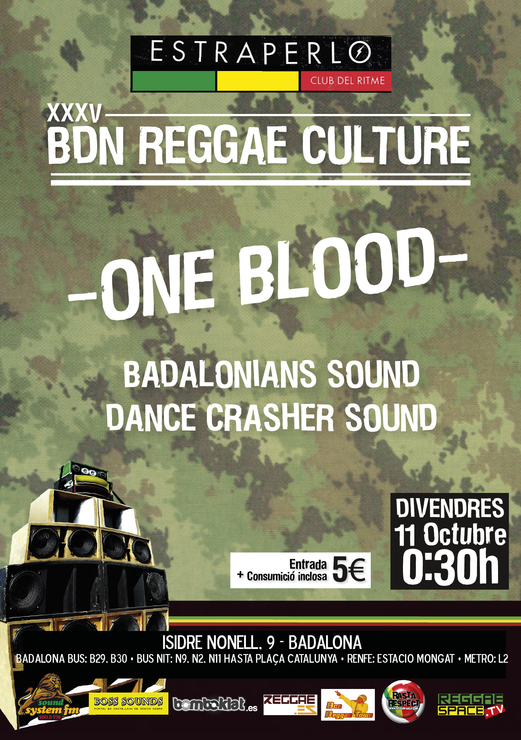 El próximo viernes 12 de Octubre a partir de las 00:30 hasta la 6:00, Bdn Reggae Culture en la sala Estraperlo de Badalona.Este mes como invitados tendremos a los veteranos One Blood Sound y los residentes Dance Crasher Sound y Badalonians Sound.