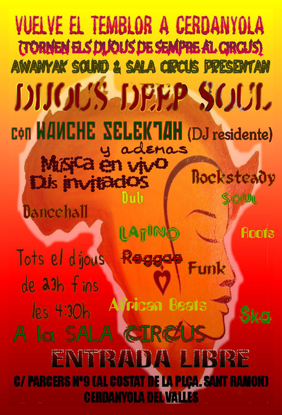 La nueva sala, insonorizada de cara a poder ofrecer espectáculos en vivo y sesiones de Dj set con toda la intensidad y potencia convenientes, ha doblado además su capacidad de aforo. Con el Circus vuelven también los populares «Dijous Reggae» como siempre de la mano del Mc y selector tinerfeño Dr Wanche, con una propuesta mejorada que intentará ofrecer semanalmente la mejor carga de vibración positiva y mensaje consciente. Así bajo el nombre de «Dijous Deep Soul» se lanza esta propuesta que espera volver a convertirse en la mejor cita del Vallés Occidental para todos los amantes del sonido negro y de la buena música en general. Sesiones que acogerán como es costumbre lo mejor de la música Jamaicana y su herencia internacional pero pretendiendo también adentrarse aún más en las vibraciones de raíz africana tales como el Funk, R&B, Rap, Soul, Latin Jazz, Salsa y música latina en general. Además intentaremos ofrecer al menos dos veces al mes eventos de música en vivo y colaboraciones de Djs y SoundSystems invitados de cara a garantizar el disfrute de aquellos que gustan de profundizar en cada uno de los géneros.
