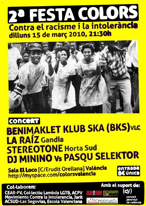 El Lunes 15 de Marzo tendrá lugar en la sala El Loko (c/ Erudit Orellana, Valencia) la 2ª Festa Colors. Contará con la presencia de Benimaklet Klub Ska, La Raíz, Stereotone y Dj Minino vs Pasqu Selektor.