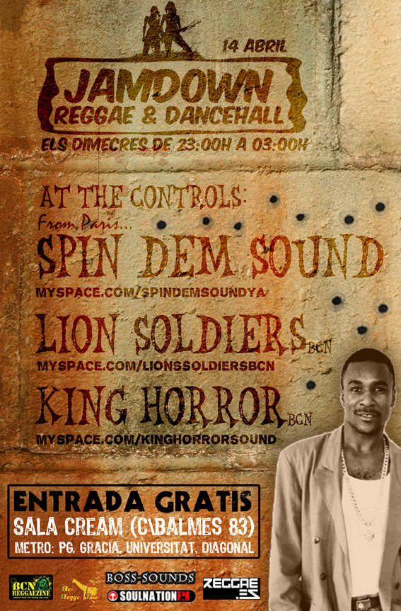 «Una semana más el Jamdown abre puertas, y para la sesión del próximo día 14 de abril nos visita como invitado especial un Sound francés, Spin Dem Sound, de la mano de su selector GoodMan. Desde hace años están promoviendo la música reggae en París, y hace dos que fundó el sound system. Para más información sobre este sound internacional, consultar su myspace: www.myspace.com/spindemsoundya También podremos contar con la presencia de los residentes Lion y . Las mezclas van des de los estilos más primitivos como el y el rocksteady hasta el más actual.»