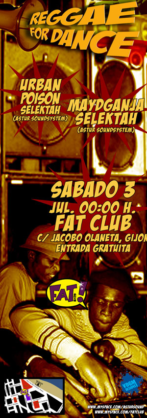«La asociación cultural Astur Sound System tiene el placer de informar de informar de que el próximo Sabado 3 de Julio se celebrará «Reggae for dance» en el Fat Club (c/ Jacobo Olañeta, Gijón), entrada gratuita, donde se recorrerán los sonidos roots, nu roots, digital, dub, dancehall y jungle. Los encargados del sonido serán Urban Poison Selektah & Maydganja Selektah (original Astur Sound System).»