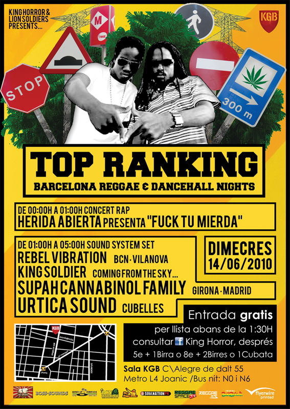 «Dicho esto, os traemos una nueva propuesta de Top Ranking para el próximo miércoles 14 de Julio, también en la sala KGB. En esta ocasión, antes de empezar el set de Djs, de 00:00h a 01:00h, tendrá lugar la presentación del nuevo trabajo de Herida Abierta, «Fuck tu mierda», rap en estado puro».