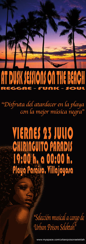 «General Sound System tiene el placer de informar que el próximo Viernes 23 de Julio, de 19:00 a 00:00 se celebrará «At dusk sessions on the Beach», en el Chiringuito Paradis, Playa Paraiso, Villajoyosa.»
