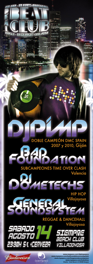 «General Sound System tiene el placer de informar de la sexta edición del Real Beat Club, fiesta mensual que se celebra en la discoteca Siempre Beach Club (avd. del puerto, Villajoyosa, Alicante), donde se recorren los sonidos nu roots, dancehall, hip hop, ska, funk y jungle.»