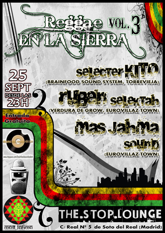 «Con el comienzo del otoño llega por fin la tercera edición de (Soto del Real, Madrid) a cargo de Mas Jahma Sound. El Sábado 25 de Septiembre nos acompañará nuevamente Ruben Selektah con su estilo depurado de reggae consciente. Esta vez el invitado será Selecter Kito, miembro de la System, el cual llegará desde Torrevieja para darnos una muestra de su visión por su debida experiencia a lo largo de tantos años sumergido dentro de la cultura reggae.»