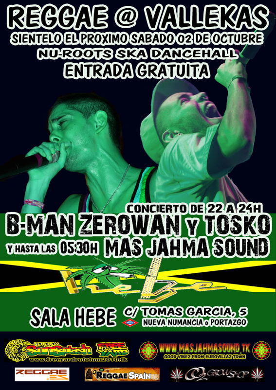 «Tras la participación de B-Man Zerowan y Tosko en la pasada edición del Rototom Sunsplash, ambos singjays continúan adelantándonos sus nuevos trabajos «Viaje a Jamaica» de B-Man Zerowan y «Lady Vida» de Tosko. En esta ocasión los podremos encontrar acompañados por Mas Jahma el sábado 2 de Octubre en la Sala Hebe de Vallecas, Madrid.»