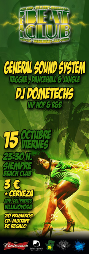 «General tiene el placer de informar de la octava edición del Real Beat Club, fiesta mensual que se celebra en la discoteca Siempre Beach Club (avd. del puerto, Villajoyosa, Alicante), donde se recorren los sonidos nu roots, dancehall, hip hop, ska, funk y jungle. Para este octavo evento contará con las sesiones de los residentes (Trebol3) y General (Villajoyosa).»
