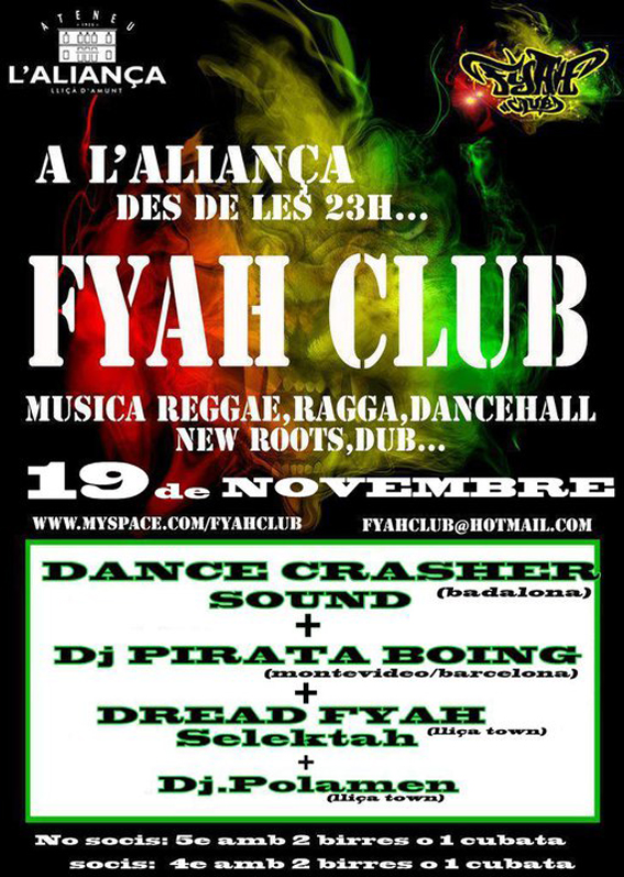 «Una semana más volvemos a nuestra segunda cita mensual al Fyah Club. Para esta ocasión tendremos un cartel de lujo con dos grandes de la escena reggae nacional: Dance Chasher (Badalona) y Dj Pirata Boing (Montevideo/Barcelona). Además contaremos con Dread Fyah Selektah y Dj Polamen»