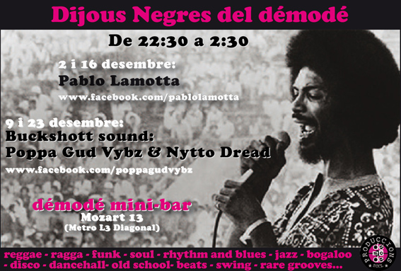 A partir del próximo 2 de Diciembre podreis disfrutar de la mejor música negra en los «Dijous Negres del DeMoDé». Funk, Reggae, Hip Hop, Soul y Groove de la mano de sus residentes, Pablo Lamotta y Buckshott Sound.