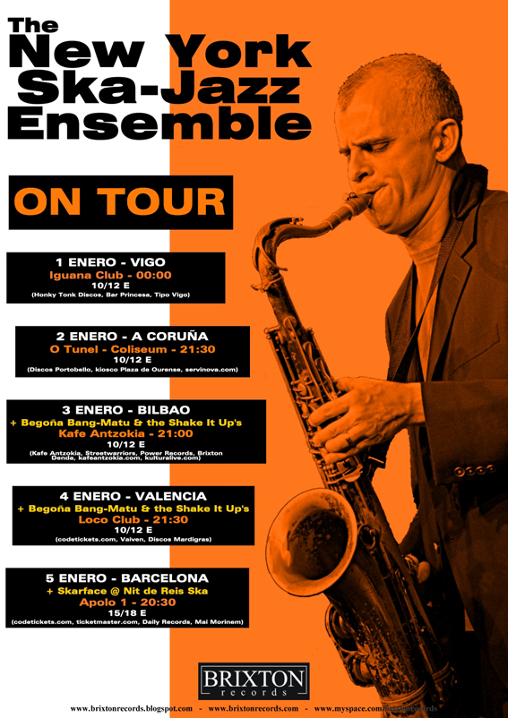 The New York Ska-Jazz Ensemble, presentando su nuevo DVD «Live in Bilbao», y Begoña Bang-Matu & The Shake It Ups actuarán el próximo lunes 3 de Enero en el Kafe Antzokia de Bilbao a las 21:00.