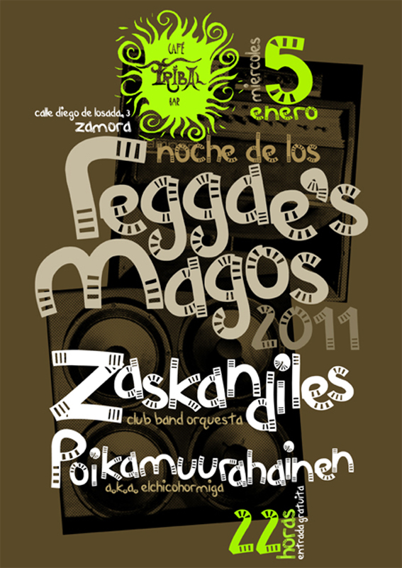 «Un año más nos complace presentar La Noche de los Reggae’s Magos 2011 en el Bar Tribal, Zamora, el próximo 5 de Enero, a partir de las 23:00 con las actuaciones, como es tradición, de Zaskandiles Club Band Orquesta, con su inconfundible ska-reggae-circus y Poikamuurahainen, seleccionando el mejor ska-rocksteady-roots-dub-dancehall.»