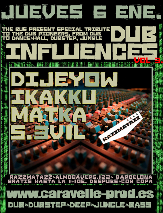 «El próximo jueves 6 de Enero, día de reyes, Caravelle Prod os invita  a la 3ª edicion de Dub Influences, noches dedicadas a la música dub y a sus influencias sobre otros estilos.»